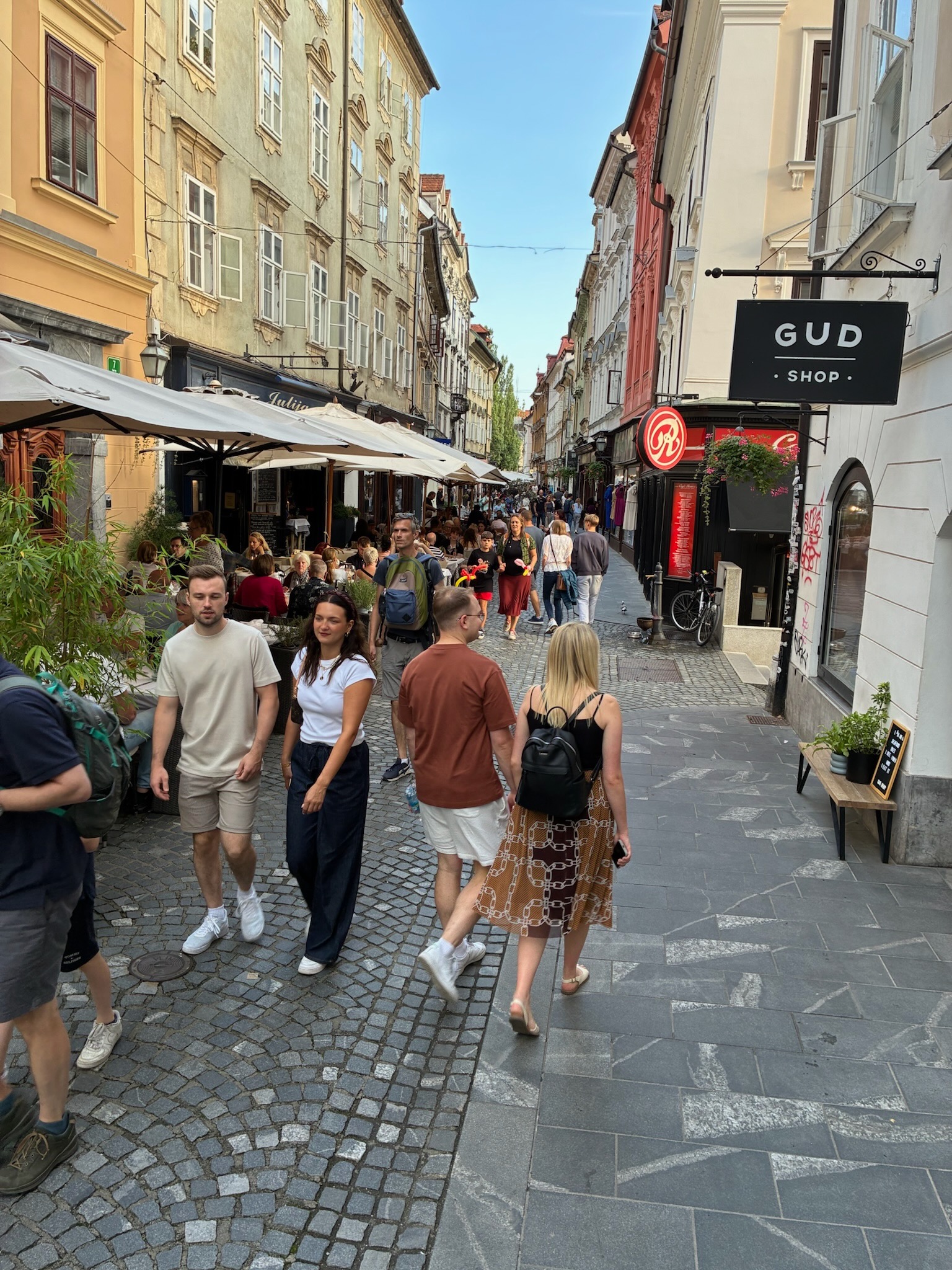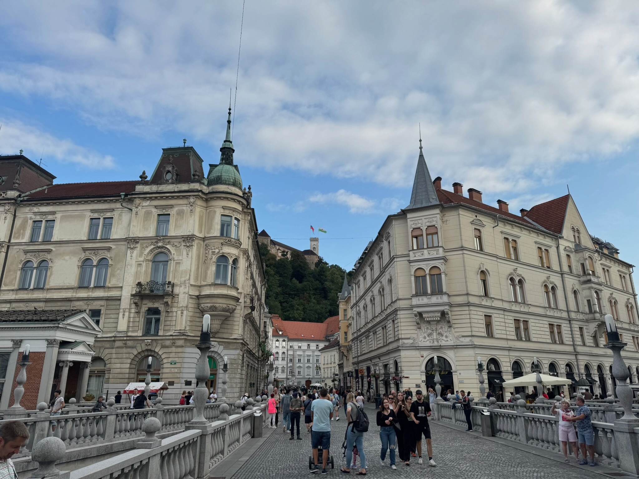 Le soir nous sommes allés en bus à Ljubljana, parfait et facile pour une soirée détente. Flânerie le long du fleuve et dans les rues parallèles, visite des endroits pittoresques sous un très beau temps. Très bon moment.