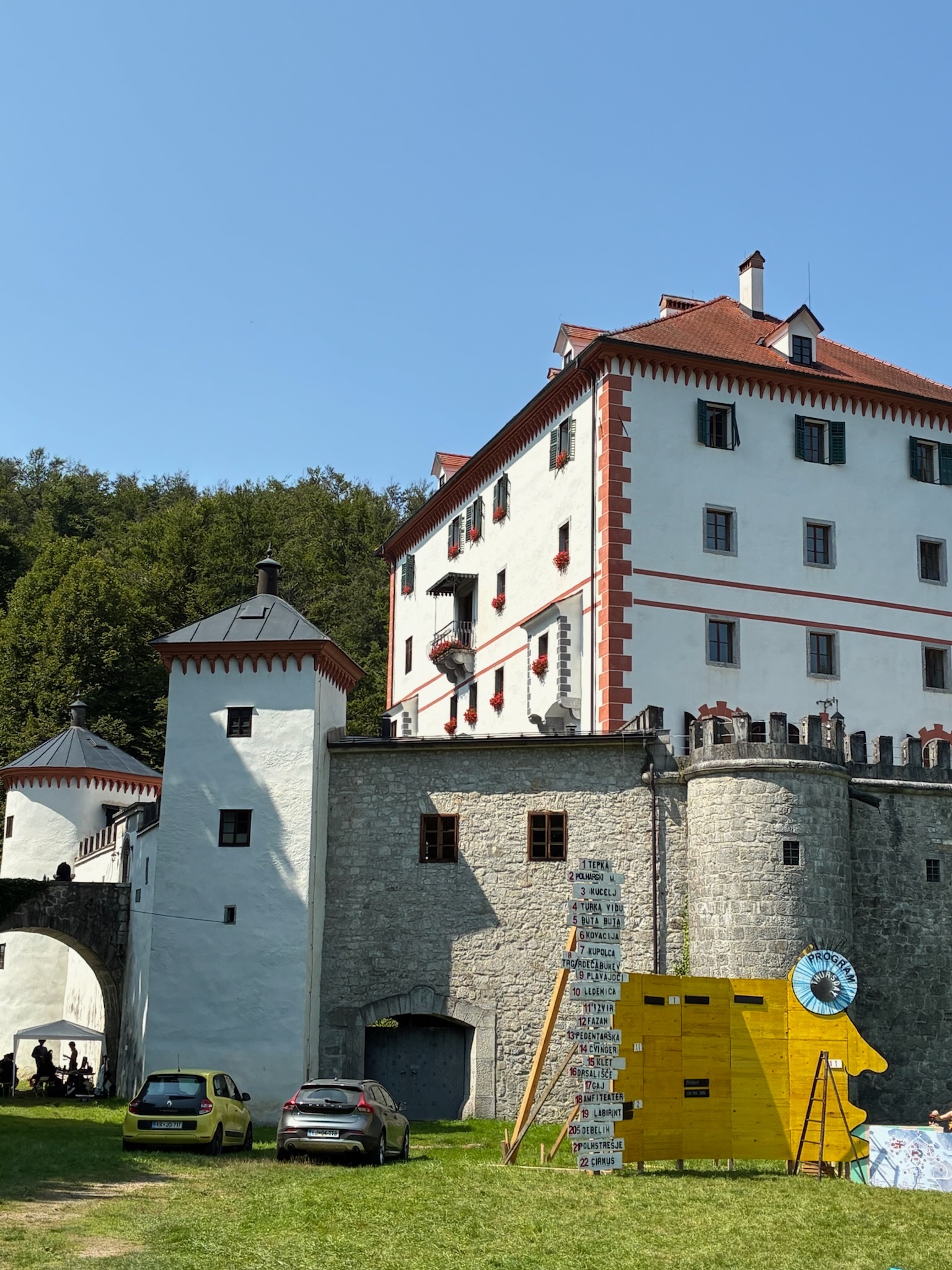 Au programme de la journée, direction la côte croate par une route secondaire annoncée comme sympa. On confirme, très belle route secondaire avec très peu de circulation. Route coupée avant d'arriver à notre première pause et... détour par un chemin non goudronné pour rallier le petit château de Sneznik où l'organisation du festival qui commencera en soirée nous laisse gentiment passer.