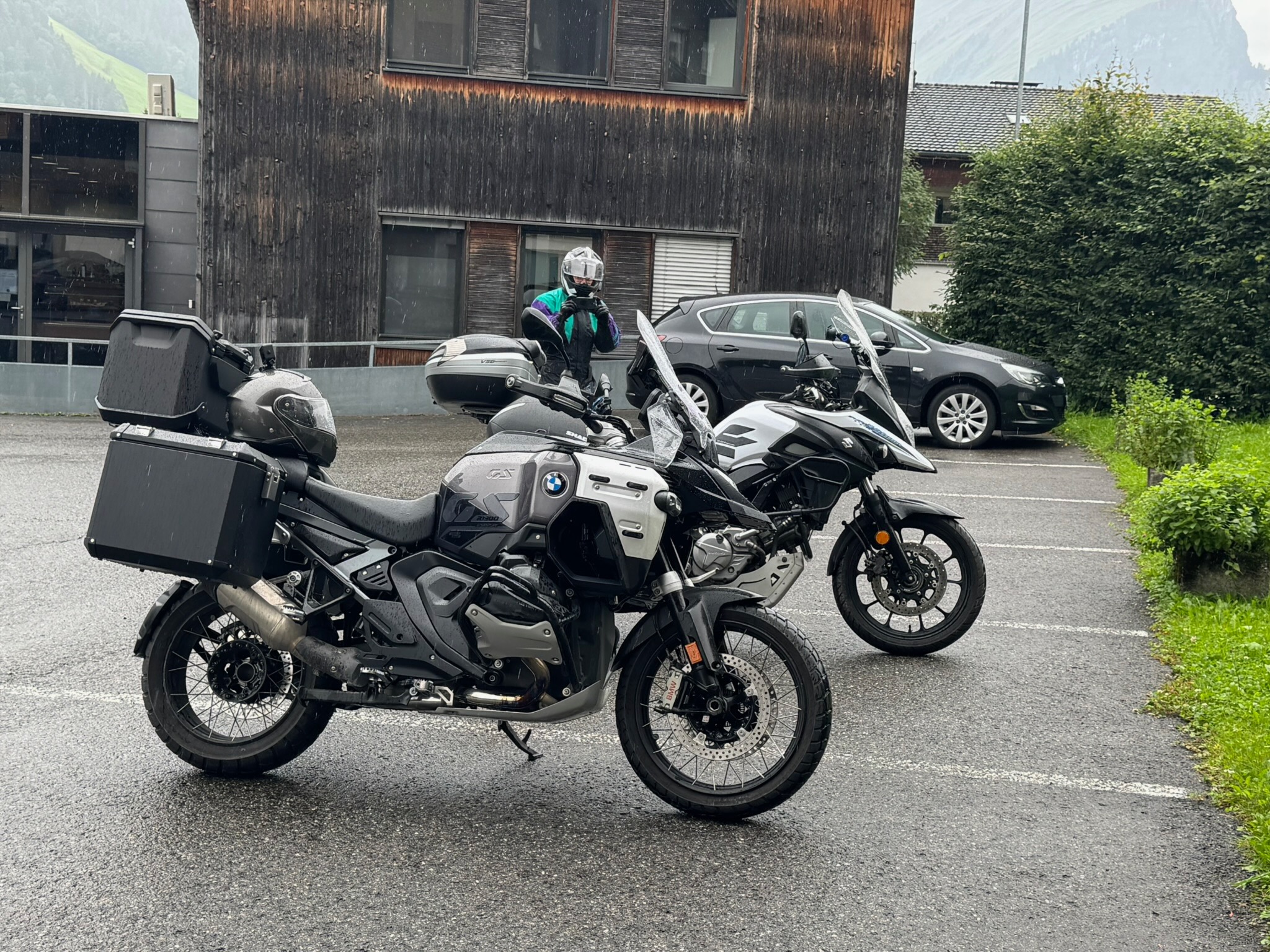 Nous avions repéré le parking de la gare pour les motos, mais nous n'avons pas osé, tout est en travaux. Par chance, 2 places moto à 50m du logement en haut de la rue piétonne qui y descend (il ne faut pas s'amuser à se garer n'importe où en Suisse).